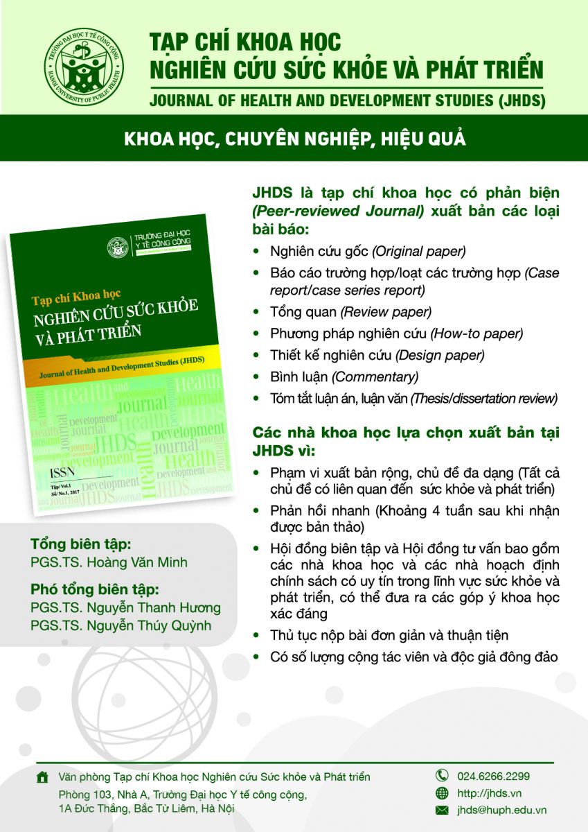 Tạp chí Khoa học Nghiên cứu Sức khỏe và Phát triển (Journal of Health and Development Studies) xuất bản các bài báo công bố kết quả nghiên cứu có giá trị khoa học và thực tiễn thuộc các lĩnh vực: